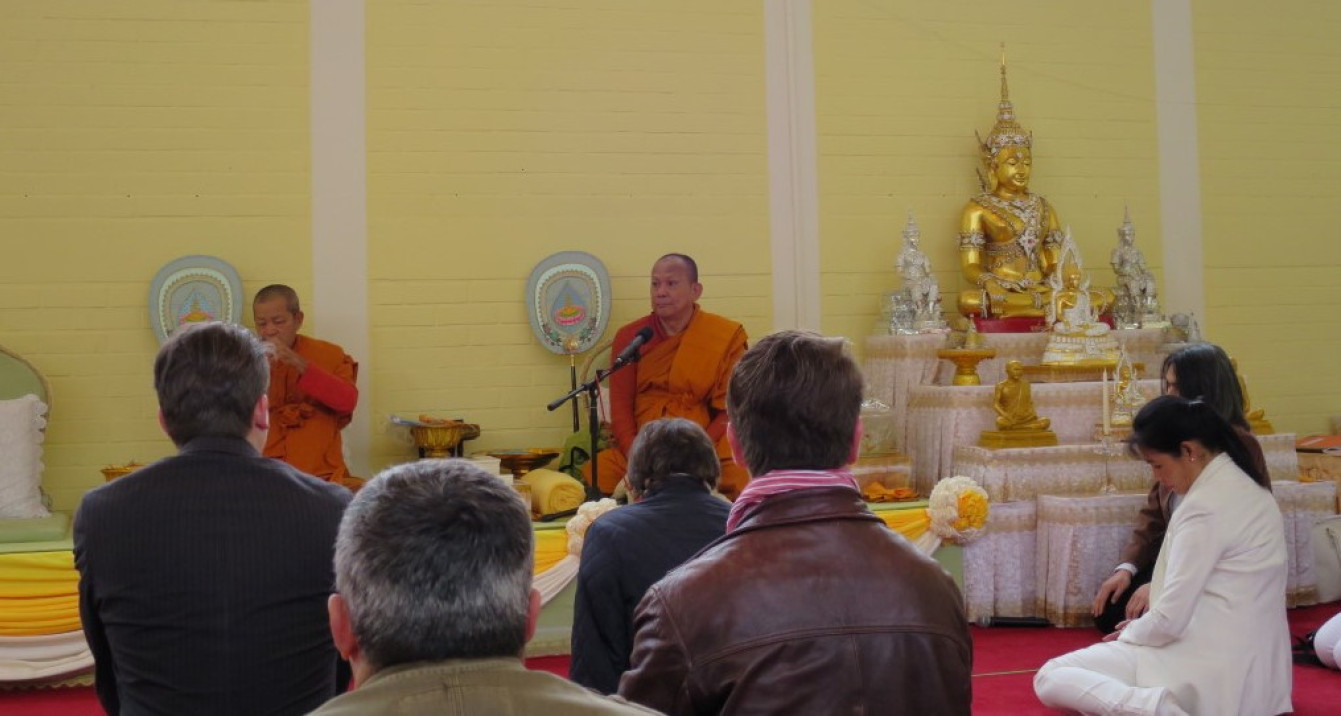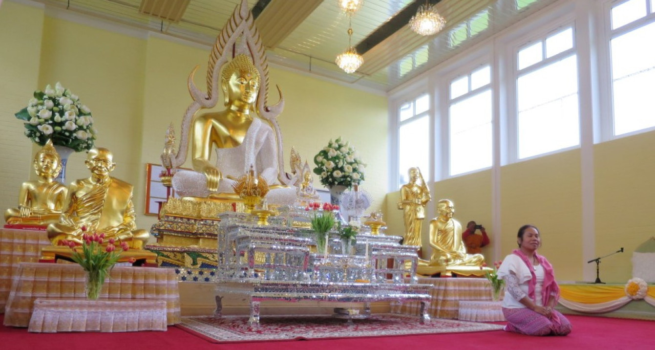 Anschließend durften die Besucher den Tempel in der ehemaligen Turnhalle betreten. Im Inneren waren die Besucher von der größten Buddhastatue in Europa tief beeindruckt. Neben den zahlreichen goldenen und silbernen verzierten Buddha-Statuen, Bildern und religiösen Gegenständen konnte die Ausstattung des Tempels bestaunt werden. Einige Frauen aus dem Verein übersetzten die buddhistische Glaubenslehre, welche von einem der Mönche vorgetragen wurde.