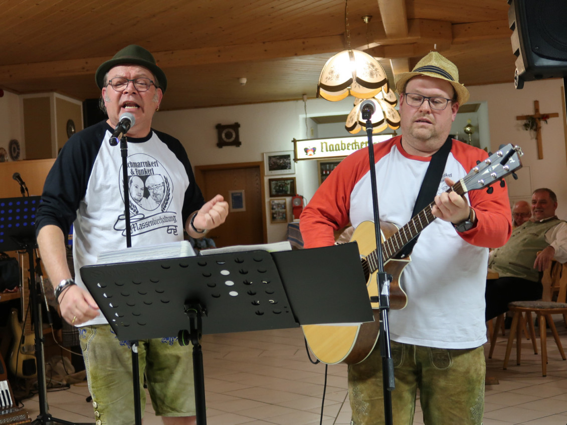 Zu späterer Stunde begeisterten „Schmarrnkerl und Funkerl“ (Helmut Haider und Stephan Karl), mit ihrer mehr als einstündigen Einlage, die Besucherinnen und Besucher. Hans Nepomuk Brunzdobler als Vertreter der Bayerischen Staatsregierung, alias Helmut Haider, verlieh zunächst Saltendorf die Bezeichnung „Bad“, was aber leider nur auf einem Missverständnis beruhte. Für den anwesenden Ersten Bürgermeister Thomas Beer und die Stadtratsmitglieder hatten die beiden Kabarettisten ein Lied über den ersten Bauabschnitt der Münchshofener Straße und die dort verpflanzten bzw. gefällten Bäume gedichtet. Zum Abschied von Romy Hermann-Reisinger aus dem Teublitzer Stadtrat zitierten sie aus der „Original-Fassung“ des MZ-Berichts, sangen das Lied „Romy“ und gaben ihr den musikalischen Rat, doch als künftige Beschäftigung den Kiosk beim Naturbad Höllohe zu betreiben. Mit der obligatorischen Zugabe „(In d‘) Hölloh‘ eigej“ verabschiedeten sich die beiden unter großem Applaus.